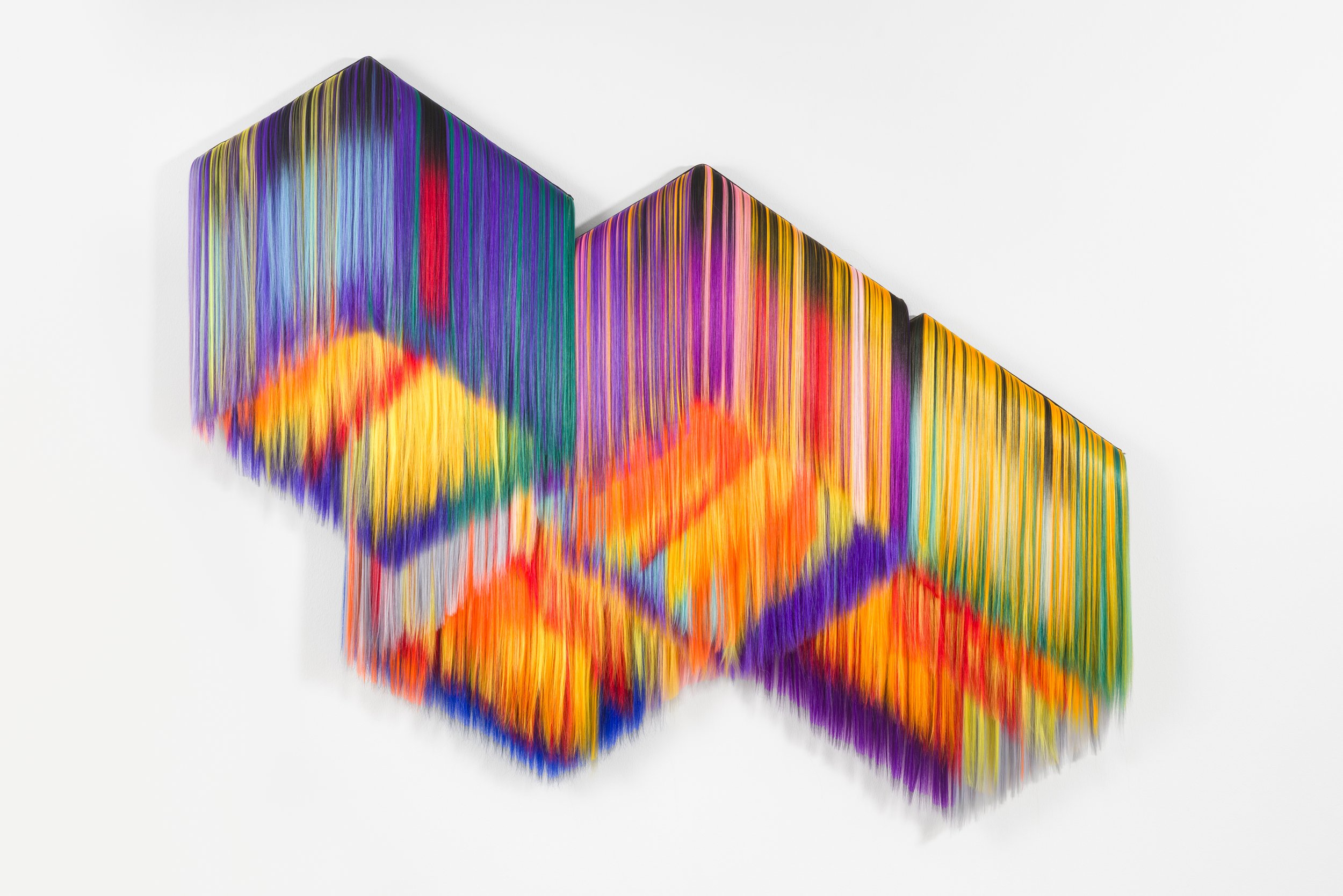The real essence of these works is in the appearance of colorful hair, which conceptually tends towards specific mental impressions. For example, at first glance, they are like an embodiment of femininity. This aspect is completely subjective. Symbolically, these hairs are the place of physical strength and a sign of the inner power of gods, goddesses and humans and refer to the drive of life, creative thought and inspiring forces. At this level, both political and erotic readings are possible. Such impressions are mostly conveyed to us through the eyes (seeing colors) and through the senses (touching).